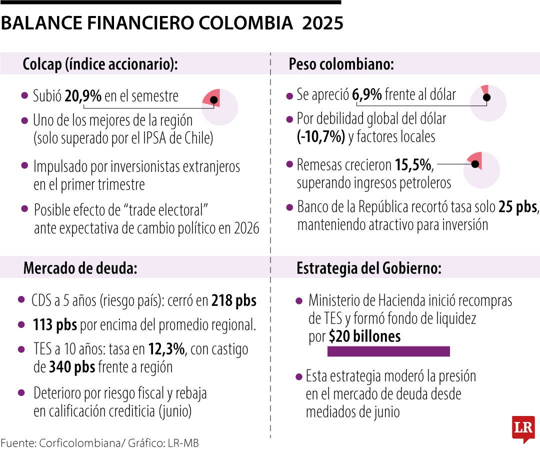 Durante el primer semestre de 2025, los mercados financieros colombianos mostraron una dinámica variada, mientras que el peso y el índice accionario Colcap se mostraron sólidos. Esto se contrasta, teniendo en cuenta que los mercados de deuda están reaccionando a los riesgos fiscales del país.