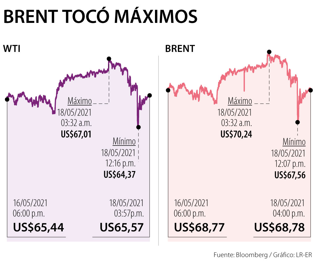 Los nuevos casos en Estados Unidos siguen disminuyendo y Nueva York levantó el requisito de las mascarillas para las personas vacunadas, por lo que el crudo estadounidense WTI tocó US$67,01 por barril, el precio más alto desde antes de la pandemia.