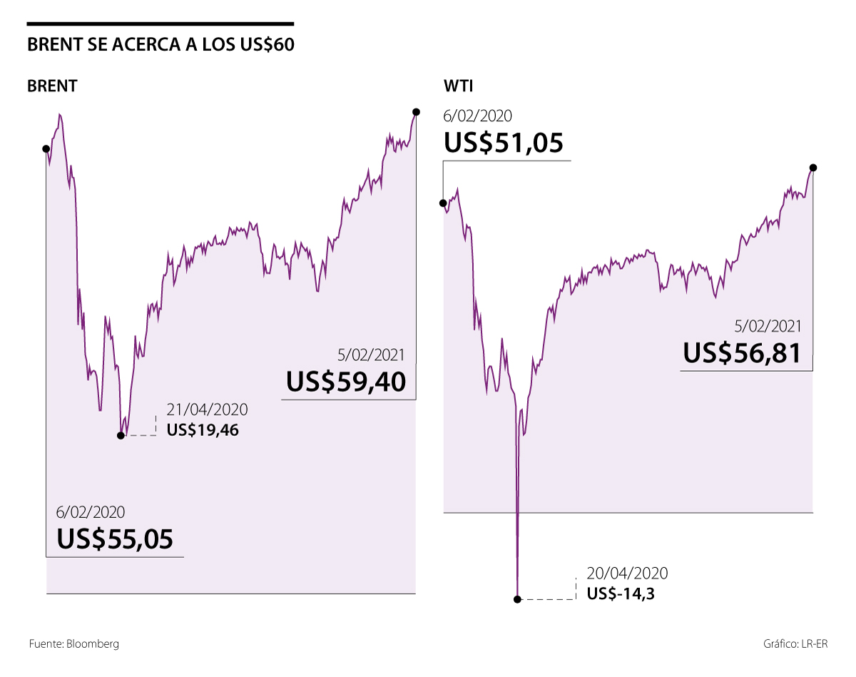 El barril de petróleo Brent, la referencia del mar del norte de Noruega, alcanzó su precio más alto en un año: US$59,40; la última vez que tocó este precio fue el 19 de febrero de 2020, fecha en la que alcanzó US$59,34, cuando aún no había estallado la crisis económica global por la pandemia.
