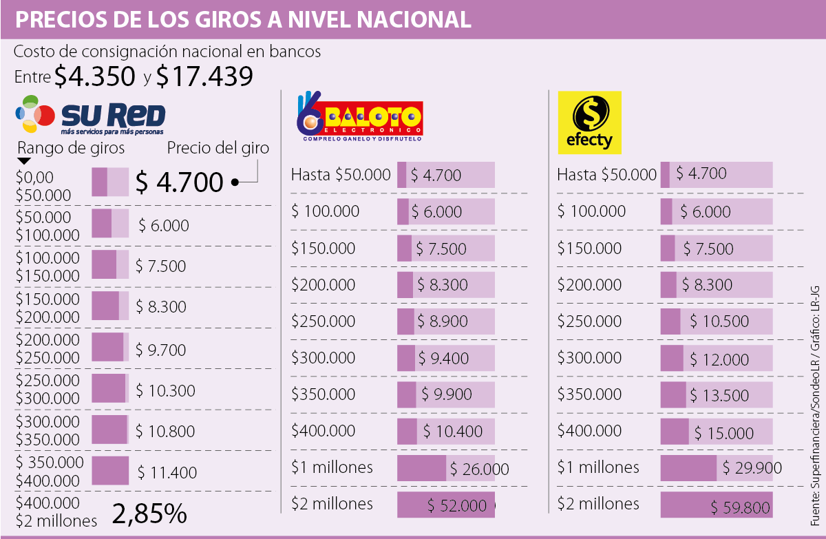 En este punto, las entidades financieras en general le cobran, independientemente del monto y dependiendo del banco, entre $4.350 y $17.439 bajo la figura de consignación nacional. Hay que aclarar que este cobro se hace solo si la persona a quien se le envía el dinero hizo su apertura de cuenta en una ciudad diferente a la del cliente que mandó el dinero, de lo contrario el costo es $0.