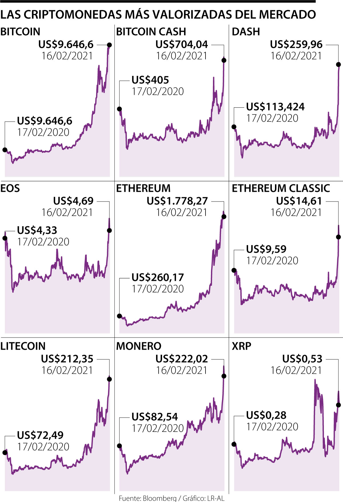 Los criptoactivos están viviendo un buen momento en bolsa. En la jornada de ayer, el bitcoin (BTC) alcanzó US$50.191 a las 7:32 a.m. en la Bolsa de Nueva York, su tercer máximo histórico en dos semanas; mientras que otra criptomoneda, considerada el gran rival del bitcoin, el ethereum (ether), alcanzó su precio más alto el pasado viernes al llegar a US$1.850,535.