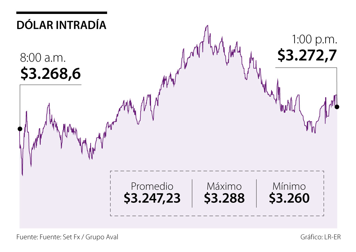 En la jornada de ayer la divisa alcanzó un precio promedio de $3.274,23, lo que representó una caída de $19,39 frente a la Tasa Representativa del Mercado (TRM), que se ubicó en $3.293,62.