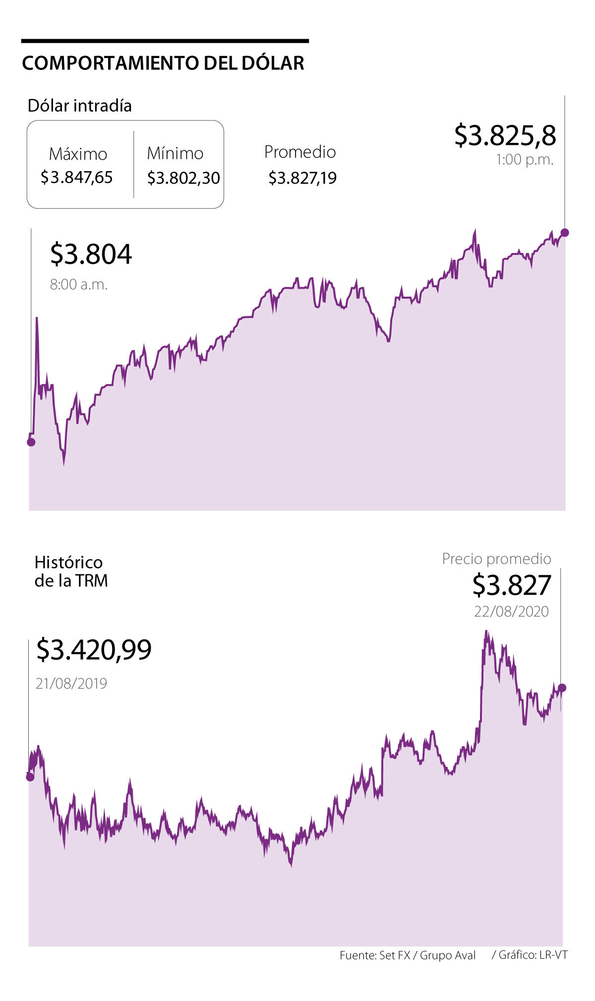 El dólar llegó a $3.827,19 su nivel más alto desde mayo. La publicación de los datos del Índice de fabricación de Compras (PMI) de agosto de Alemania (53,7 puntos) y Francia (51,7 puntos) dispararon la cotización de la moneda estadounidense, debido a que el comportamiento aleja la posibilidad de que se dé una recuperación en V.