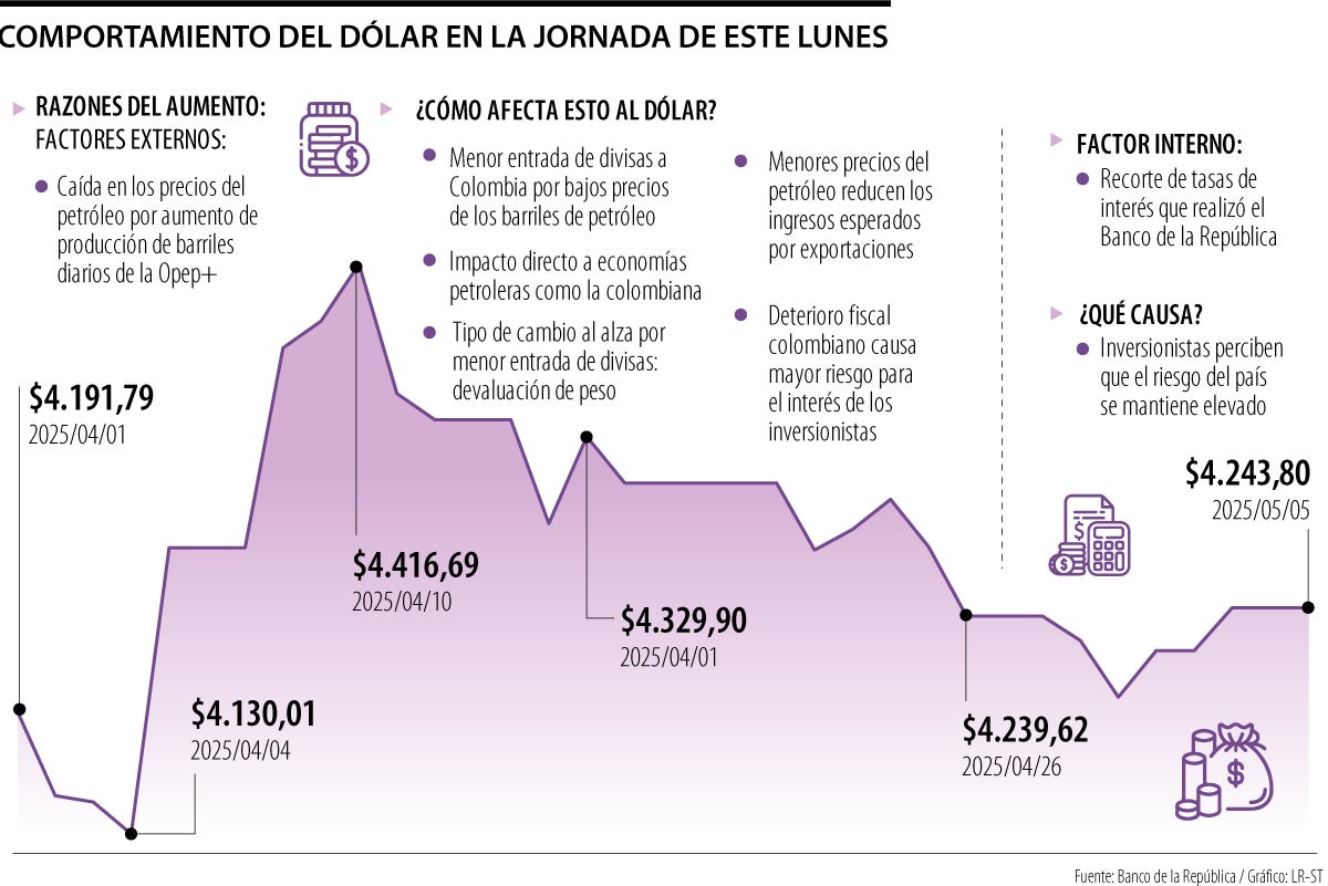 Juan David Ballén, director de análisis y estrategia de Aval Casa de Bolsa, explicó que “la debilidad económica”, producto de la guerra comercial de EE.UU., sumada al aumento de la producción de petróleo de la Opep+, mantendría el precio del petróleo bajo, “lo cual afectaría el ingreso fiscal esperado del Gobierno nacional” y reduciría la entrada de dólares en Colombia en este tiempo.