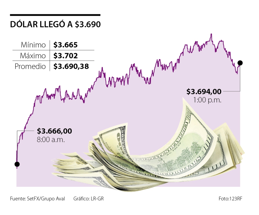 El viernes, el dólar alcanzó un precio promedio de $3.690,38, lo que representó un alza de $30,23 frente a la TRM, que se ubicó en $3.660,15.