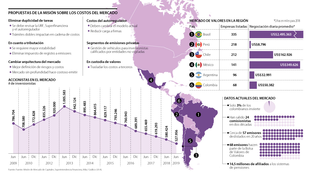 El analista bursátil Andrés Moreno, comentó que los altos costos que se han generado para las empresas y los inversionistas han causado una salida del mercado por parte de estos últimos. De acuerdo con un reciente informe basado en datos de la Superintendencia Financiera, a junio de 2019 había cerca de 527.956 inversionistas en el mercado, frente a los 786.704 que se contaban hace una década y los más de un millón que se tenían en los registros en 2011 con el auge de emisiones protagonizado por Davivienda, Ecopetrol y la Empresa Energía de Bogotá.