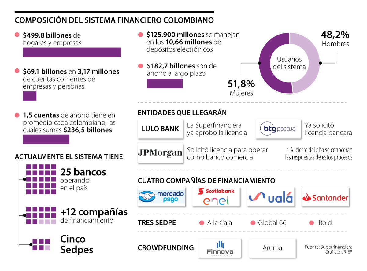 Las entidades bancarias que operarían en el país son JP Morgan, BTG Pactual y Lulo Bank. Según Castaño, la respuesta a la solicitud de JP Morgan para operar como banco comercial podría conocerse en diciembre, mientras que BTG Pactual ya presentó su licencia bancaria. En el caso del neobanco de la familia Gilinski, su aprobación la recibió a comienzos de año.