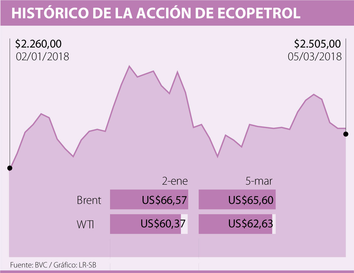 De esta manera, entre enero y marzo, el título ha ganado 9,7%, desde $2.260, hasta los $2.505 con los que cerró la semana ayer; sin embargo, en algunos momentos, la especie llegó a negociarse en niveles de $2.800, gracias a los niveles históricos de tres años en los que se negociaba el Brent a finales de enero.