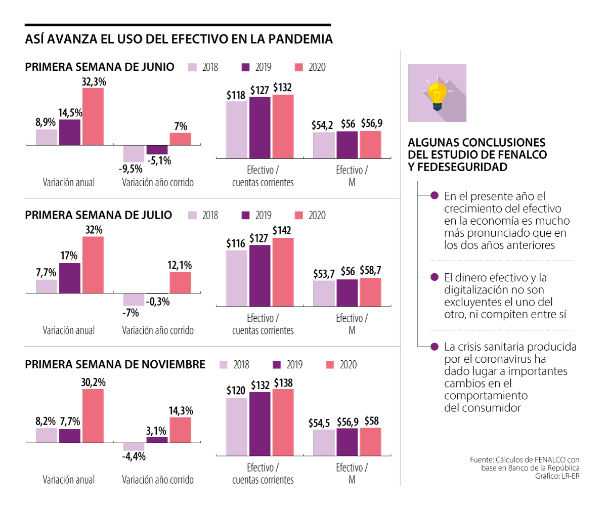 “Al cierre de la primera semana de junio de 2018 el crecimiento de esta variable (uso del efectivo) para el año completo (12 meses) era de 8,9%, a la misma fecha de 2019 la variación fue de 14,5% y el dato correspondiente a 2020 marca un alza de 32,3%”, destacaron Fenalco y Fedeseguridad en su investigación sobre el uso de efectivo en la economía colombiana durante este año.