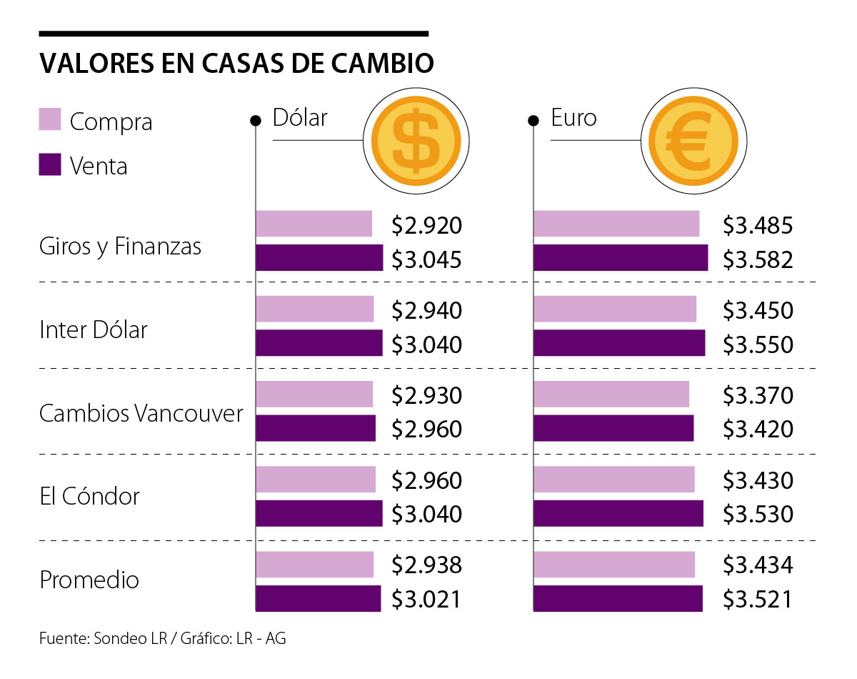 En el caso del dólar, las casas de cambio lo estarán vendiendo $3.021 en promedio, superando los $3.000 por primera vez en el año. Entre tanto, para compra, los profesionales de cambio lo estarán adquiriendo en promedio a $2.938.