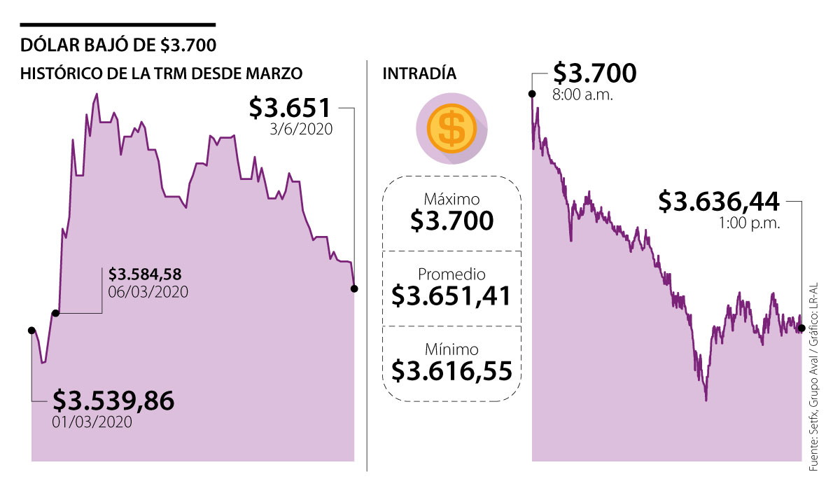 Después de tres meses, el preció del dólar bajó de niveles de $3.700 y, con una caída intradía de $64,94, se negoció en un precio promedio de $3.651,41, el más bajo desde el pasado 6 de marzo, cuando la tasa de cambio se cotizó en promedio a $3.584,58.