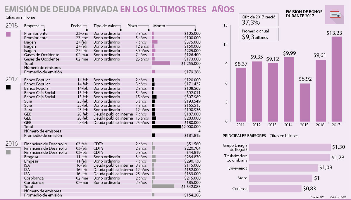 En 2018, son tres las compañías que han decidido participar en la emisión de bonos. La primera fue Promioriente, que, el 23 de enero, puso en el mercado $205.000 millones, distribuidos en dos emisiones de cinco y siete años, por los que recibió ofertas de $369.760 millones.