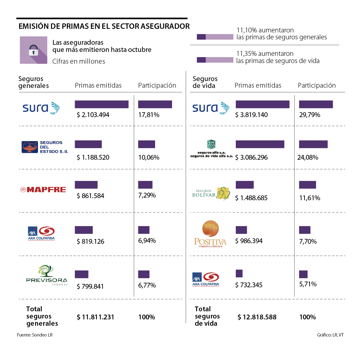 Le siguen en emisión de primas Seguros del Estado, con $1,19 billones; Mapfre, con $861.584 millones; Axa Colpatria, con $819.126 millones, y Previsora Seguros, con $799.841 millones.
