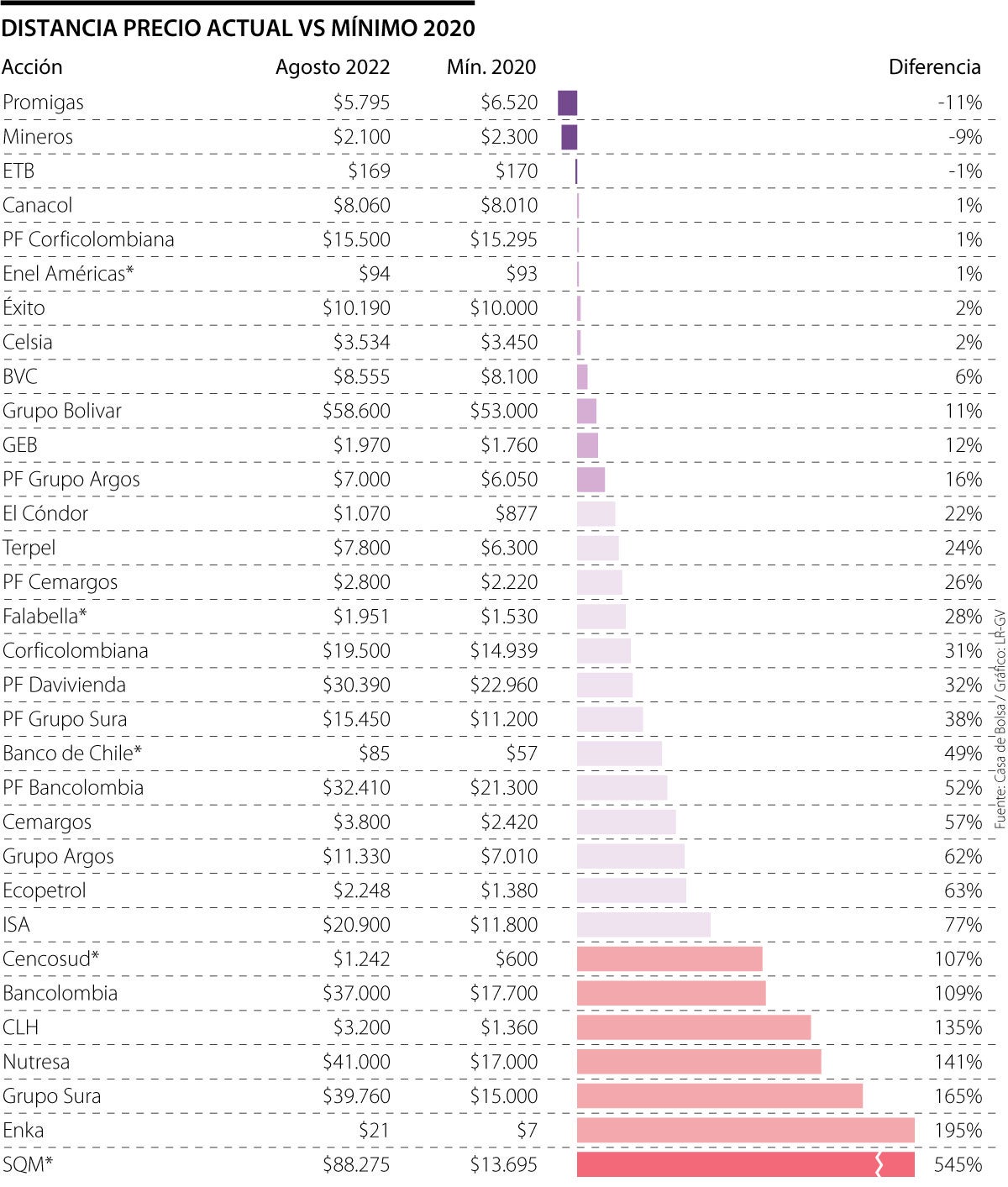 Con lo anterior, el colombiano está en el top tres de los índices latinoamericanos que más caen este año. Bajo este panorama, varios de los emisores que cotizan en el mercado local han retrocedido hasta ubicarse en niveles cercanos a los precios de cierre mínimos observados durante 2020, cuando se reflejaron los efectos de la pandemia.