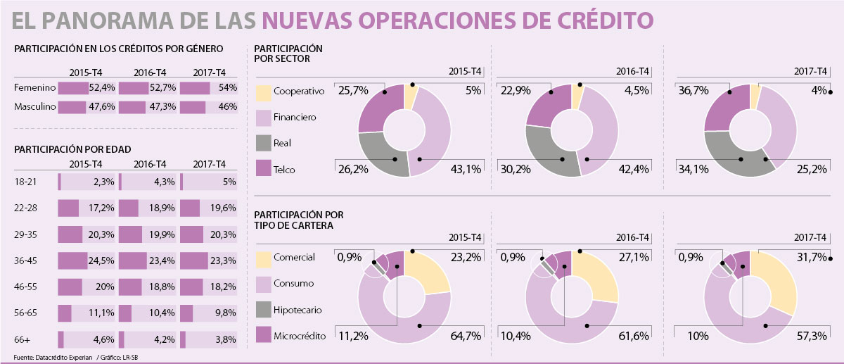 Se debe resaltar que otros de los perfiles que presentaron un crecimiento importante fueron las mujeres que lideran el otorgamiento de créditos con 54% respecto a 46% que tuvieron los hombres durante el último trimestre de 2017, lo que significó un aumento en la participación de 3 puntos entre 2015 y 2017. Y Datacrédito informó que “las mujeres no solicitan estos créditos para gastar sino invertir y una parte importante va para la educación de los hijos”.