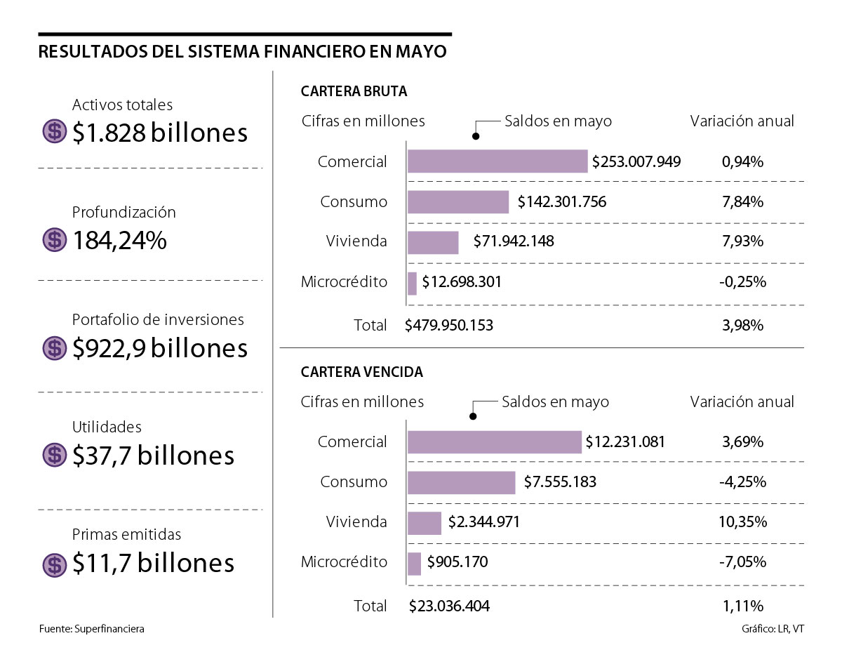 Al quinto mes del año, la cartera comercial vencida tuvo un saldo de $12,23 billones (3,69%); la de consumo vencida, $7,56 billones (-4,25%); la de vivienda vencida, $2,35 billones (10,35%), y la de microcrédito vencida, $905.170 millones (-7,05%).