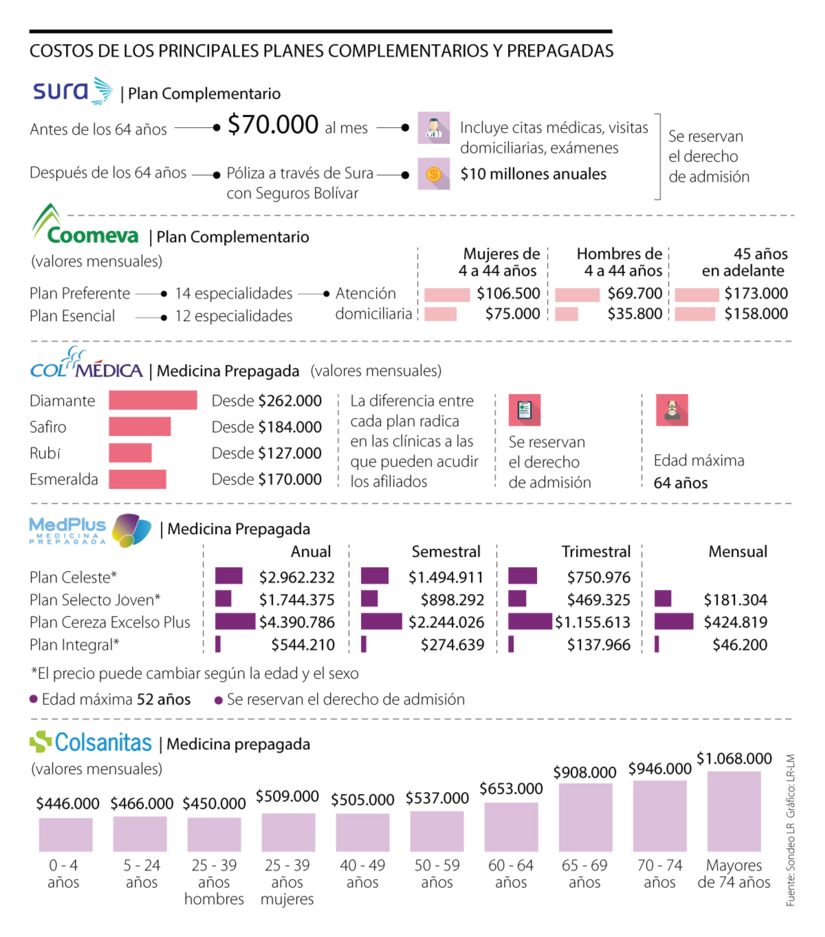 Los precios para un plan complementario de salud o de medicina prepagada van desde $63.000 hasta $1,06 millones al mes. La tarifa, determinada por cada entidad, depende de la edad del usuario y, en algunos casos, del género de la persona.