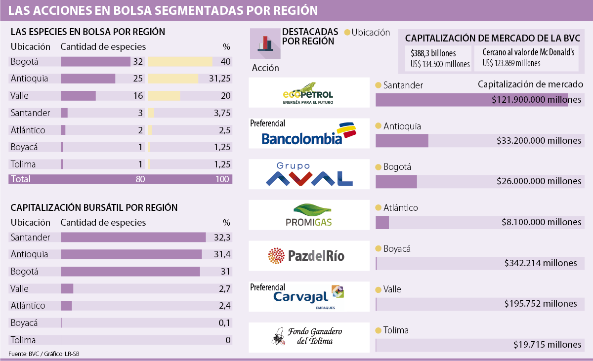 Sin embargo, el mismo análisis por región demuestra que Santander y Antioquia son, por encima de la capital, las que concentran un mayor porcentaje de la capitalización de mercado de la BVC, que es de $388,3 billones.