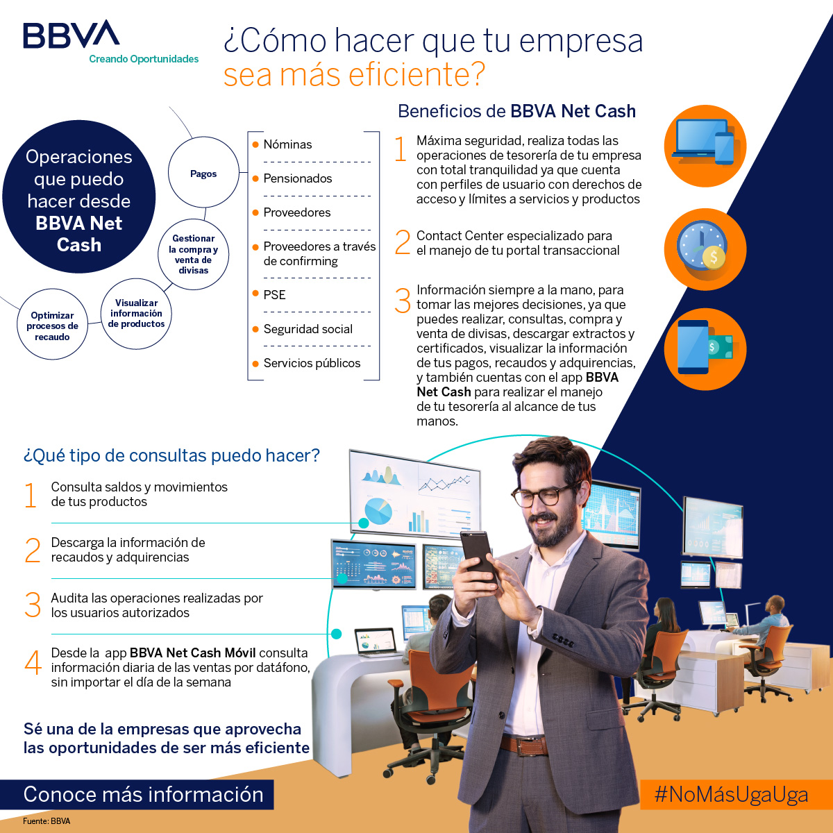 Frente a estas necesidades del mercado, el banco BBVA a través de su portal empresarial ofrece servicios transaccionales desde los más básicos hasta los más especializados tales como: consultas de cuenta de ahorro, corriente, tarjetas de crédito, préstamos y leasing, al igual que transferencias a cuentas de cualquier banco, pago de nómina, proveedores, pensionados, negociación de divisas y descargas de archivos de recaudo, adquirencia y conciliaciones de saldos y movimientos. Es de destacar que BBVA también ha puesto a disposición de sus clientes el app BBVA Net Cash móvil, para que las empresas puedan realizar el manejo y gestión de su tesorería desde la comodidad de su celular y a tan solo un clic.