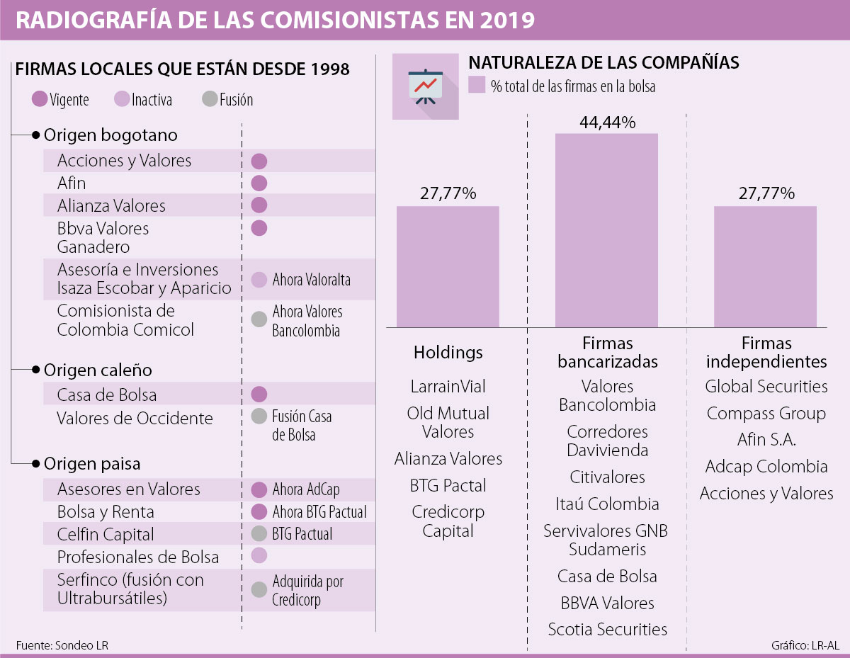 También, de esa época solo quedan siete vigentes: Acciones y Valores, Afin, Alianza Valores, Bbva Valores, Asesores en Valores (ahora Adcap), Bolsa y Renta (actualmente BTG Pactual) y Casa de Bolsa. A estas se suman Asesoría e Inversiones Isaza Escobar y Aparicio (ahora Valoralta) que está inactiva y otras cuatro que fueron fusionadas (ver gráfico).