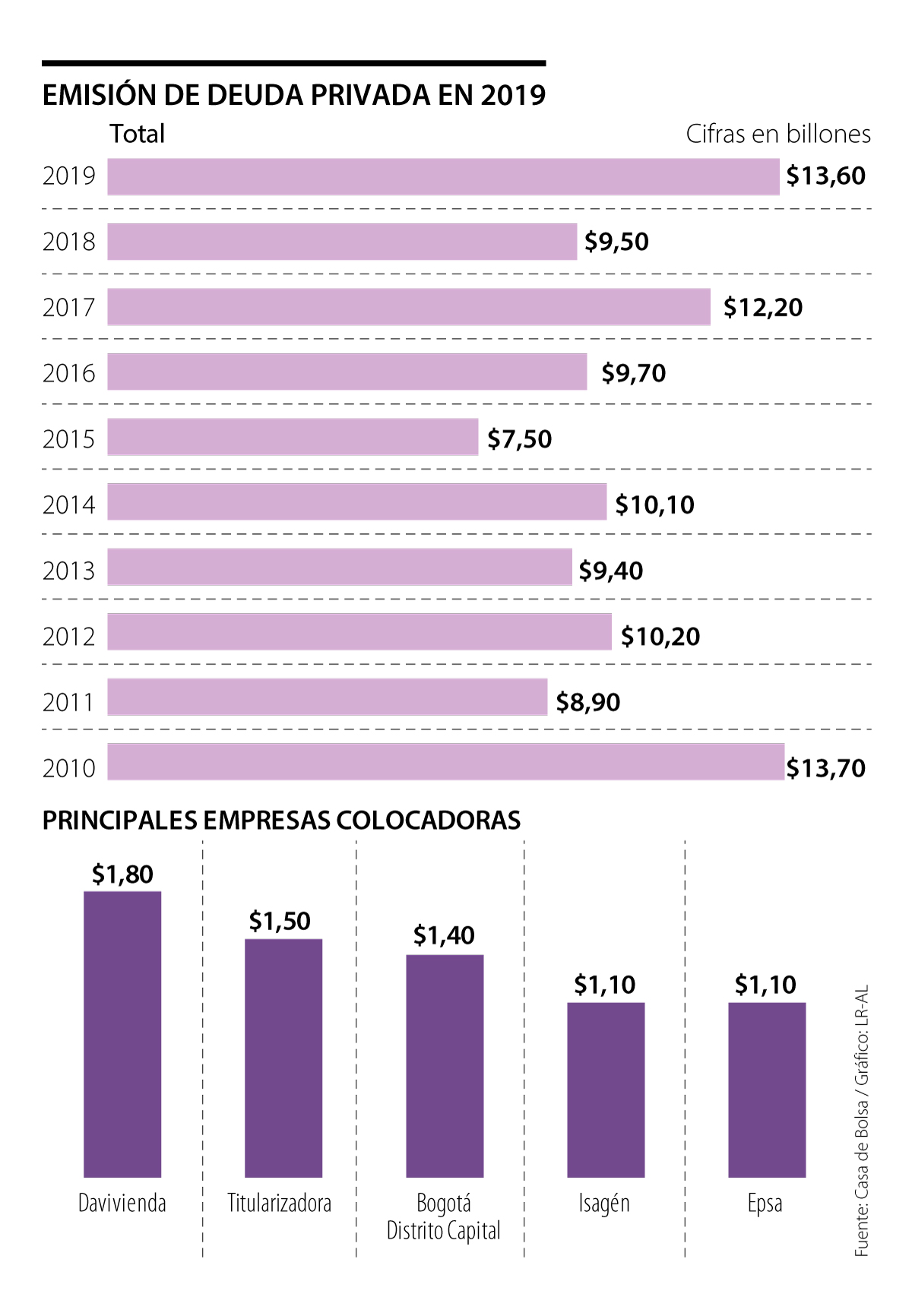 En 2019, el sector privado en Colombia alcanzó la emisión de deuda más alta en los últimos nueve años, con $13,6 billones, cifra que se acercó a los $13,7 billones de 2010 y que representó un alza de 42,6% frente a los $9,05 billones de 2018, detalló un reporte de Casa de Bolsa.