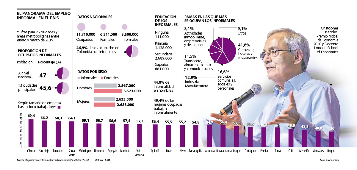 Altas tasas de informalidad, un mercado laboral con pocas libertades y un salario mínimo con un crecimiento mayor a los índices de productividad fueron algunos de los retos en materia laboral que afronta Colombia mencionados por Christopher Pissarides, ganador del premio Nobel de Economía en el año 2010 y docente de la universidad inglesa London School of Economics.