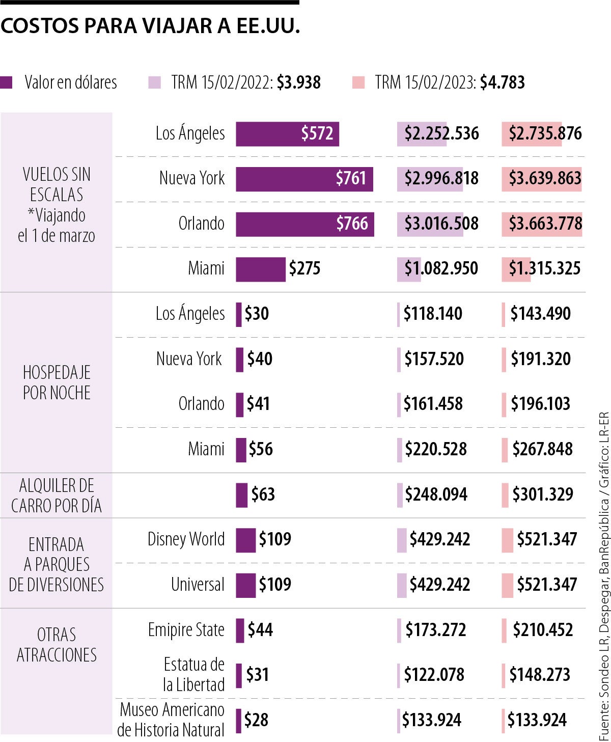 El vaivén del billete verde no solo impacta a los inversionistas y comerciantes, sino también a la gente del común que, por ejemplo, planea irse de vacaciones. Para evaluar el impacto y el crecimiento que ha tenido este gasto en un año (entre el 15 de febrero de 2022, y el mismo día en 2023), LR realizó un sondeo con algunos de los destinos más turísticos de EE.UU.