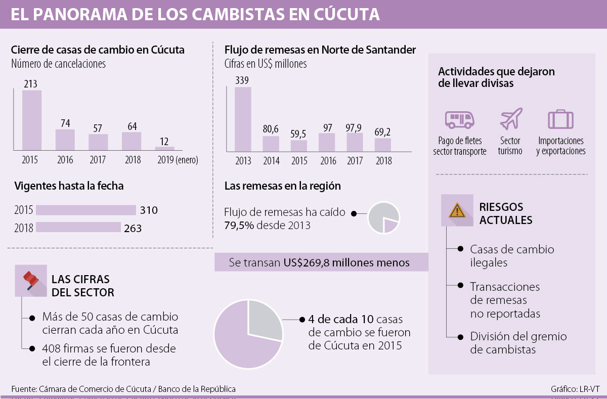 Cuando en 2015 se decidió el cierre de la frontera, la Cámara de Comercio de Cúcuta contabilizó 310 firmas vigentes dedicadas a esta actividad económica, lo que significó el cierre de 213 cambistas, pues ese año al sector lo conformaban 523 casas de cambio.