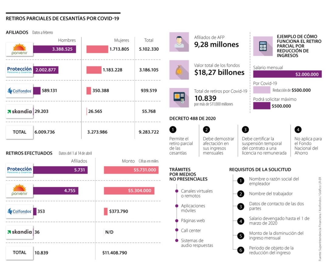 A finales de marzo, el Gobierno expidió el Decreto 488 de 2020, con el que les permite a los trabajadores colombianos solicitar el retiro parcial de sus ahorros de cesantías, si certifican que tuvieron afectaciones en sus ingresos, como reducciones de salario o licencias no remuneradas, entre otros, debido al aislamiento social obligatorio por la llegada de la pandemia del Covid-19 a Colombia. LR estableció que, al 14 de abril, 10.839 colombianos ya hicieron uso de esta opción.