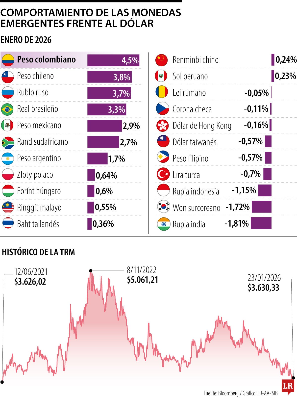 En enero, el peso colombiano es la moneda más revaluada entre las emergentes. La divisa local tuvo un alza de 4,5% en lo que va de 2026. En el listado de las más valorizadas en los primeros días del año, el peso chileno y el rublo ruso ocupan el segundo y tercer puesto con 3,8% y 3,79%, respectivamente. También figuran entre las más revaluadas el real brasileño (3,39%), peso mexicano (2,9%) y rand sudafricano (2,7%) reflejando un mayor apetito por activos de mercados emergentes, mejores flujos de capital y expectativas más favorables sobre política monetaria en estas economías. Por otro lado, las monedas emergentes más desvalorizadas durante enero son la rupia india (-1,8%) y won surcoreano (-1,7%).