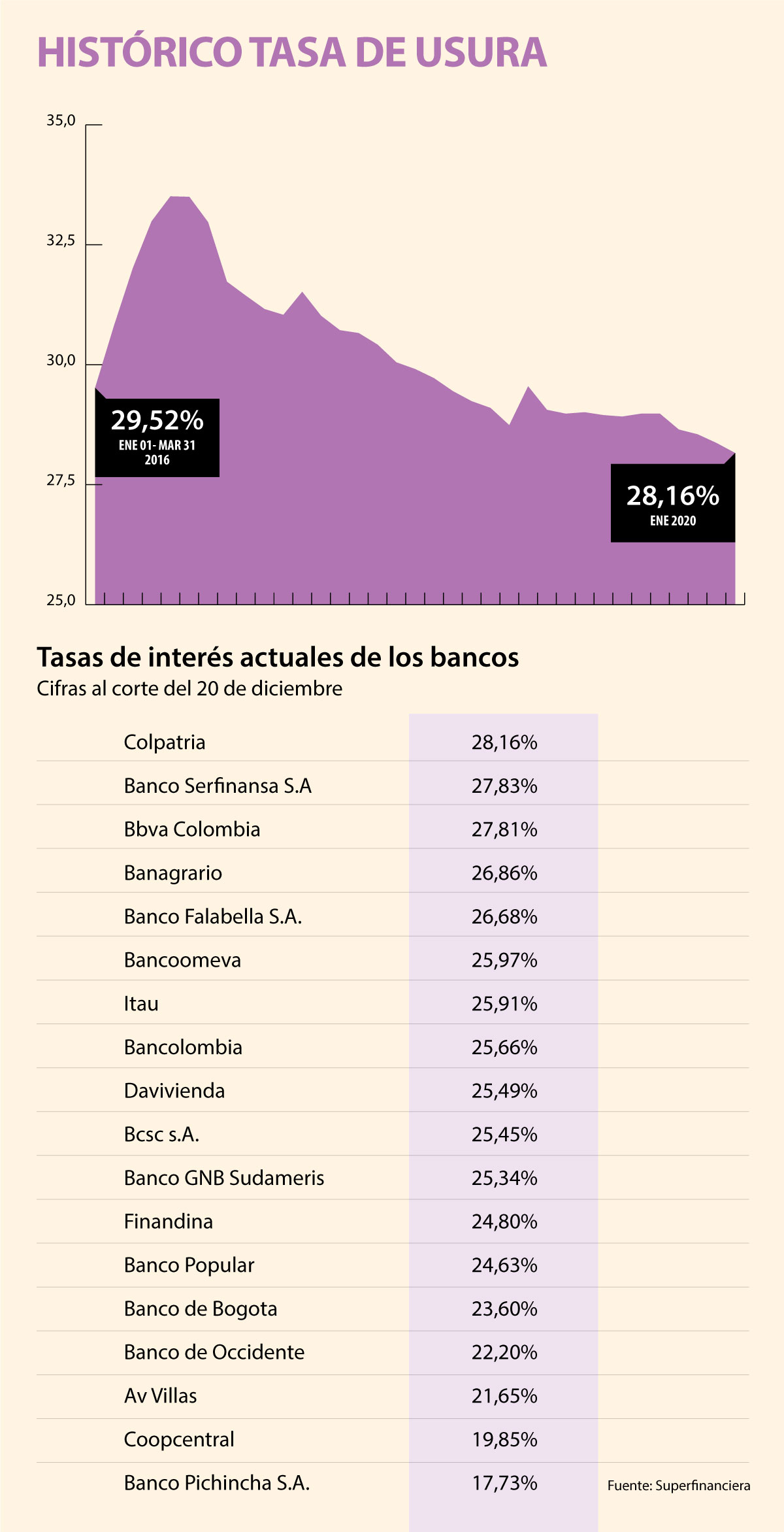 Algo que llama la atención es que según los datos reportados por la Superfinanciera al corte del 20 de diciembre dan cuenta que todos los bancos están por debajo del tope de interés para enero. En este momento, las tasas más altas del sector están en 28,16%; pero el promedio está en 24,76% efectivo anual.