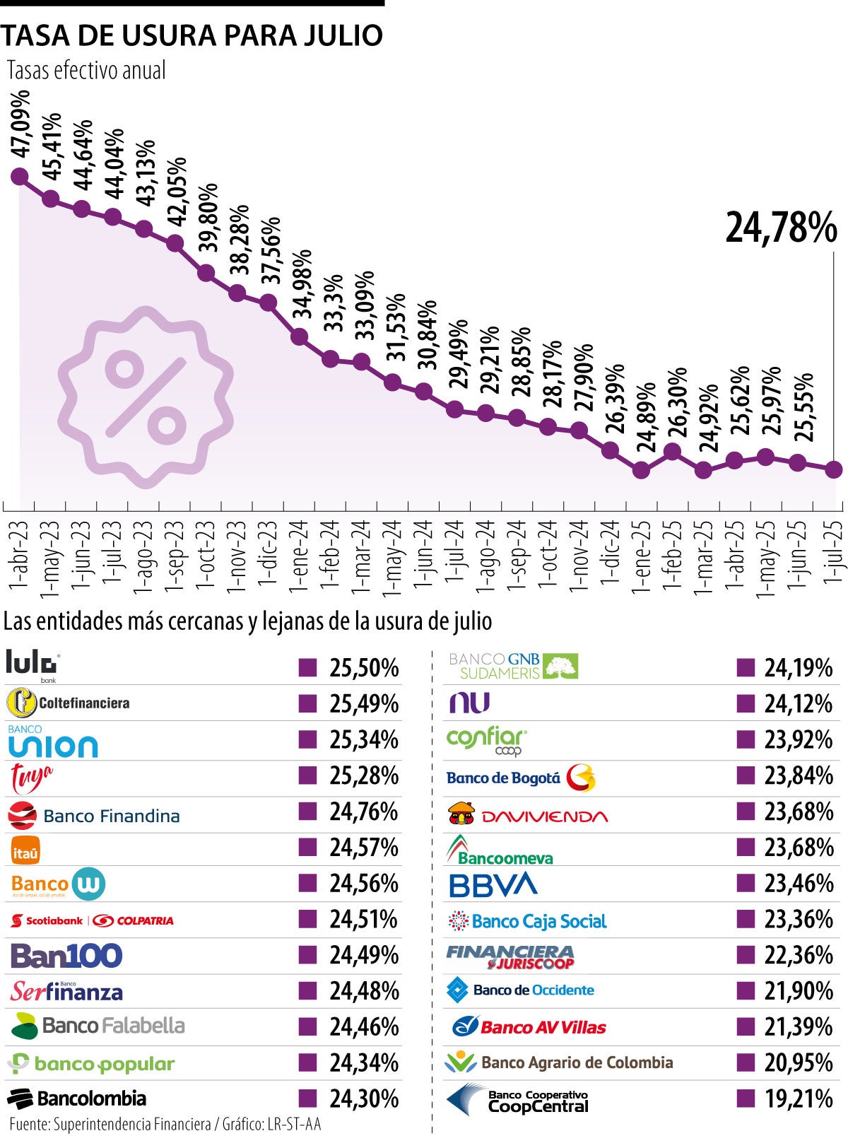 La Superintendencia Financiera de Colombia certificó el interés corriente bancario para julio, el cual cayó 0,77 frente a junio, llegando a 24,78%. Esto quiere decir que los bancos bajan el techo de los intereses que le pueden cobrar por sus préstamos. Este límite de cobro es una de las modalidades estructurales más criticadas por el sector.