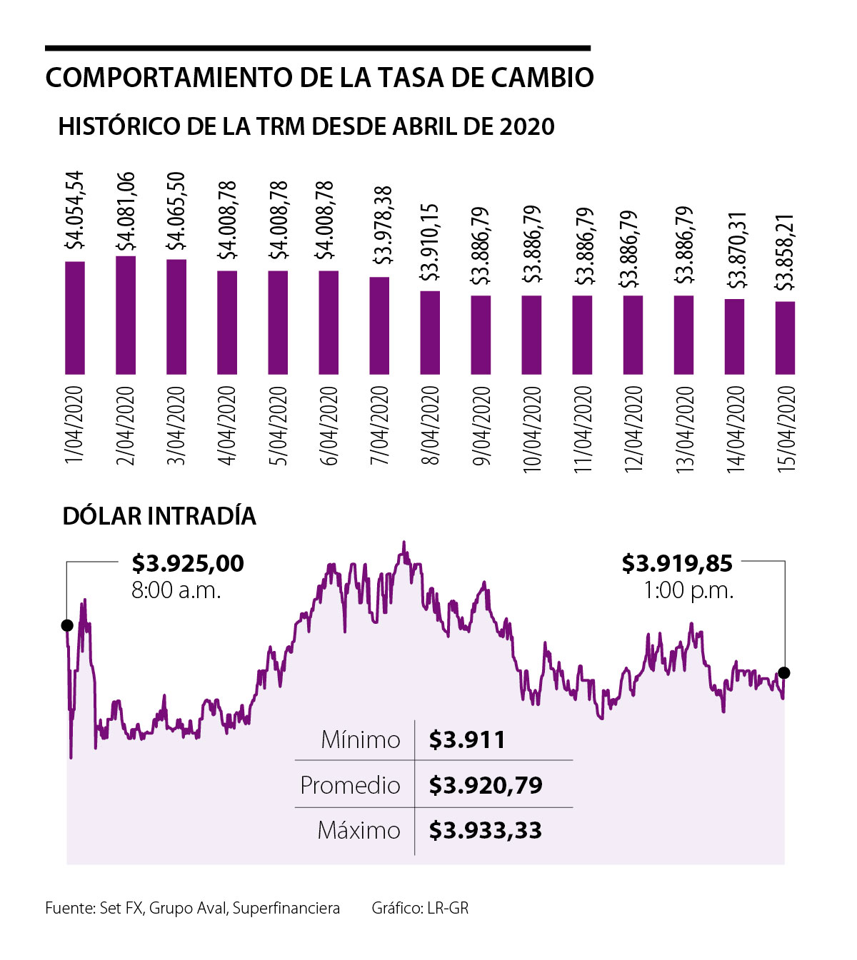 Al comparar el precio promedio del dólar del pasado 1 de abril con el alcanzado ayer se evidenció que en la quincena la tasa de cambio bajó 3,94% ($160,88), pues pasó de $4.081,06 a $3.920,79.