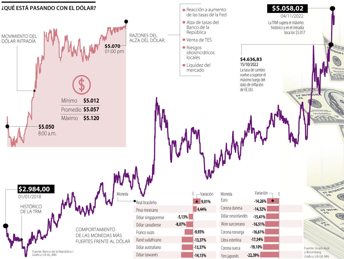 En promedio, ayer el dólar se cotizó a $5.057,93. Aunque la semana pasada la divisa dio cuatro jornadas de respiro, esta semana volvió con la tendencia alcista y parece que no quiere dar tregua alguna.