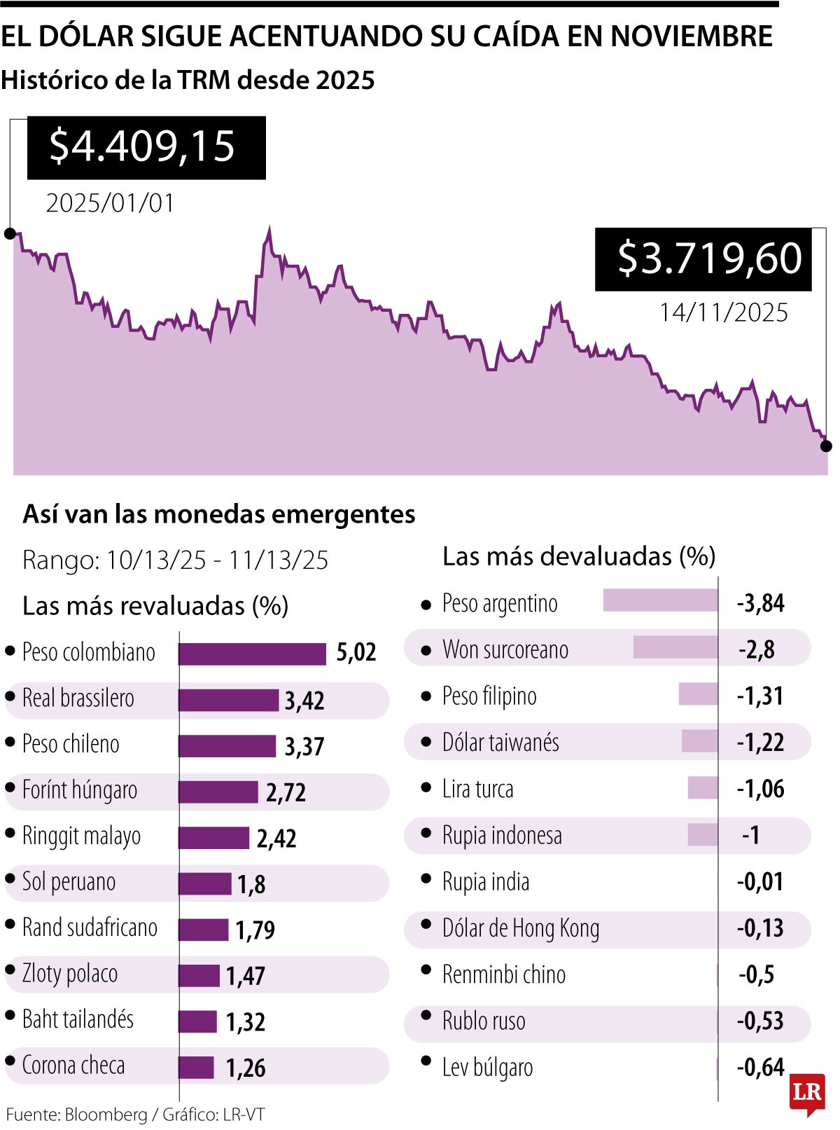 Durante el último mes, el peso colombiano ha sido la moneda más revaluada entre las emergentes. Datos de Bloomberg arrojan que desde el 13 de octubre al 13 de noviembre tuvo un avance de 5,02%. En segundo y tercer lugar están el real brasilero y el peso chileno, con 3,42% y 3,37%, respectivamente. Les siguen el fortín húngaro (2,7%); ringgit malayo (2,4%); sol peruano (1,8%); rand sudafricano (1,7%); zloty polaco (1,4%); y baht tailandés (1,3%).