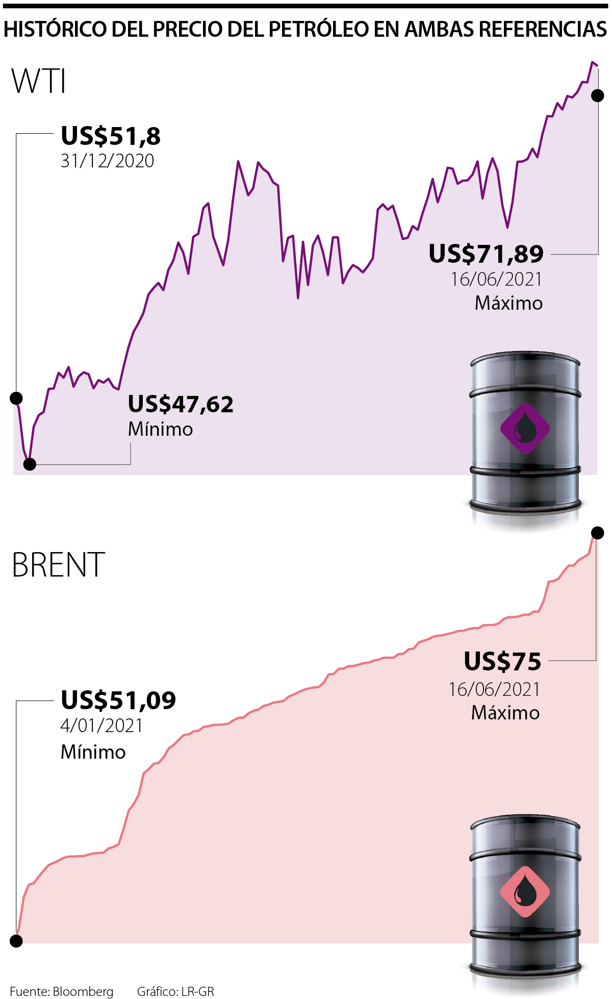 En el mismo sentido, la referencia norteamericana WTI ha crecido más de 290%, mientras que en los últimos doce meses ha subido 88,30% o US$33,89. En lo que va del año ha ganado 85,88%o US$23,76 y en lo que va de junio ha aumentado 6,63% a US$71.
