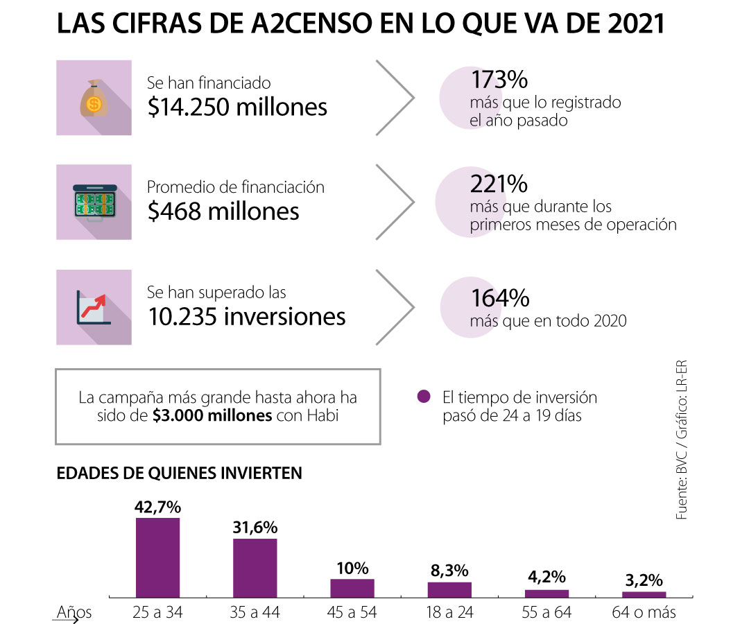 La plataforma de crowdfunding de la Bolsa de Valores de Colombia (BVC), a2censo, facilitó la inversión de $14.250 millones; es decir, 72% más que durante el primer año de funcionamiento de la plataforma, cuando registró una financiación total de $8.268 millones. En total se han canalizado $22.518 millones a través de 71 campañas.