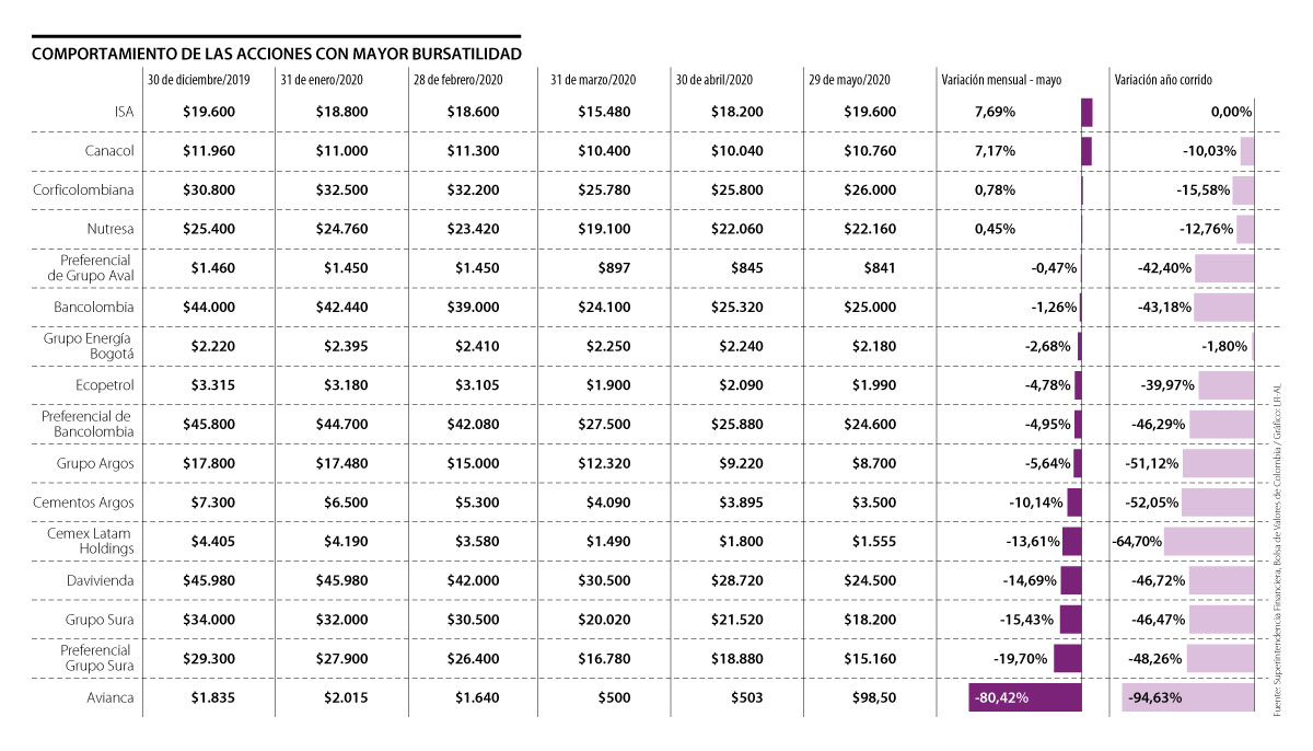En cuanto a la acción que más se desvalorizó en los primeros cinco meses del año, esta fue la de Avianca, que en este periodo perdió 94,63%. Su precio al inicio del año era $1.835, mientras que finalizó mayo en $98,5.