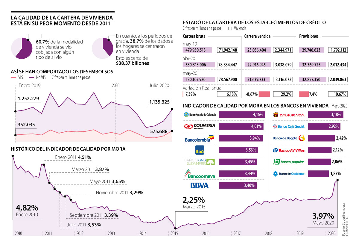 Por su parte, Davivienda, entidad que registró un indicador de calidad por mora en la cartera de vivienda de 3,18% a mayo, señaló que “el aumento en la cartera vencida de vivienda se debe a que los clientes que venían con una mora mayor a 60 días antes del periodo de crisis sanitaria, no lograron ser acogidos dentro de las medidas de alivio. Esto provocó un rodamiento en esta cartera, particularmente en los meses más estrictos de la cuarentena”.