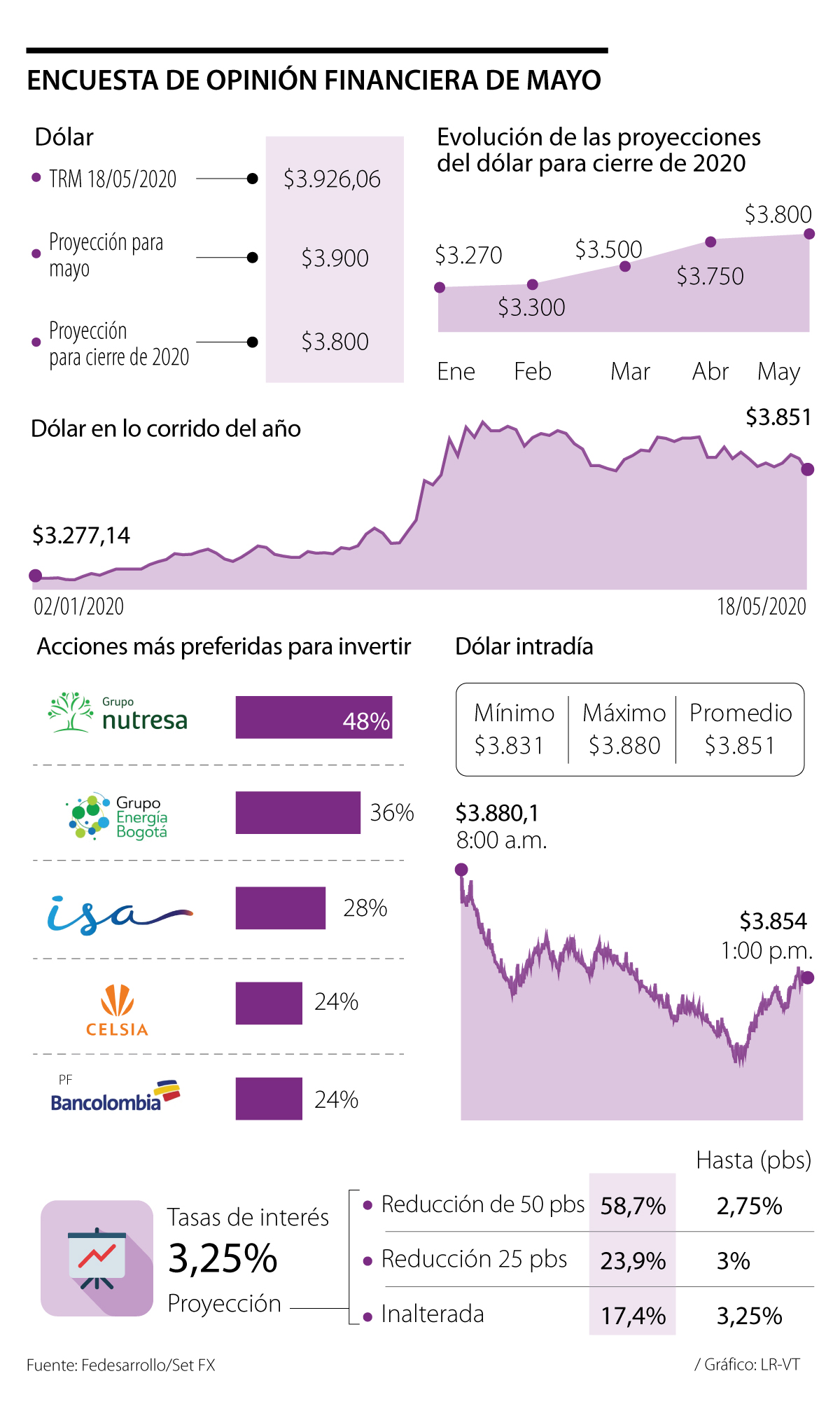 Entre tanto, en la Encuesta de Opinión Financiera (EOF) de mayo, publicada ayer por Fedesarrollo, la mayoría de analistas cree que la divisa continuará cercana a este nivel durante los próximos meses.