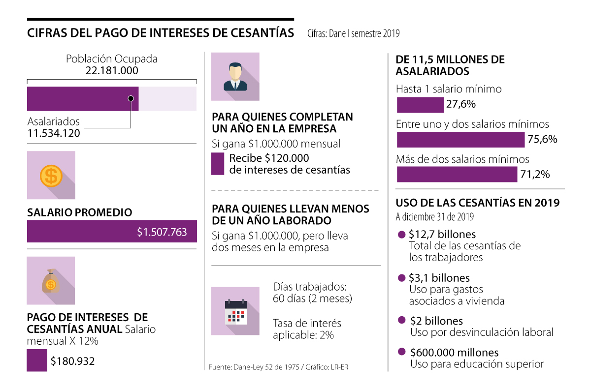 Con base en lo anterior, LR realizó un cálculo para determinar cuál es el monto promedio que un trabajador asalariado recibe, basado en los números del Departamento Nacional de Estadística (Dane), operación que dio como resultado ingresos por intereses de cesantías al año de $180.932.