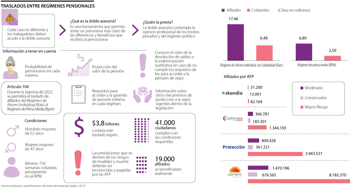 Desde octubre de 2016 se estableció la doble asesoría como un requisito para que los afiliados y cotizantes puedan realizar su traslado de un régimen a otro. Esta opción permite tener claras las diferencias y beneficios que recibirá al momento de pensionarse en cada uno de los sistemas. Dicha herramienta contempla el análisis de cada caso, tanto de parte de los fondos privados, como de Colpensiones.