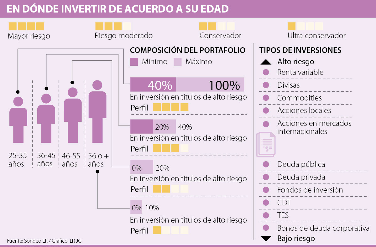 Daniel Lombana, analista de renta fija de Acciones y Valores, explicó que “los inversionistas tendrán un perfil más conservador entre más edad. Mientras que los jóvenes tienen un perfil mucho más amante al riesgo, porque si tienen 25 años y pierden 10% del dinero invertido, tienen más tiempo y posibilidad para recuperarlos. Diferente a cuando se tiene una mayor edad, con más compromisos y menor tiempo”.