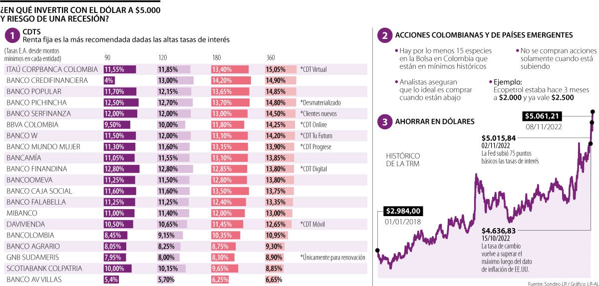 Una buena opción, según los expertos, son los Certificados de Depósito a Término (CDT). “Hay que aprovechar las altas tasas de interés que hay. Tenemos tasas de interés no vistas hace más 20 años, entonces invertir en renta fija es una gran posibilidad antes de que el próximo año las vuelvan a bajar precisamente por la recesión”, aseguró Andrés Moreno Jaramillo, analista económico y bursátil.