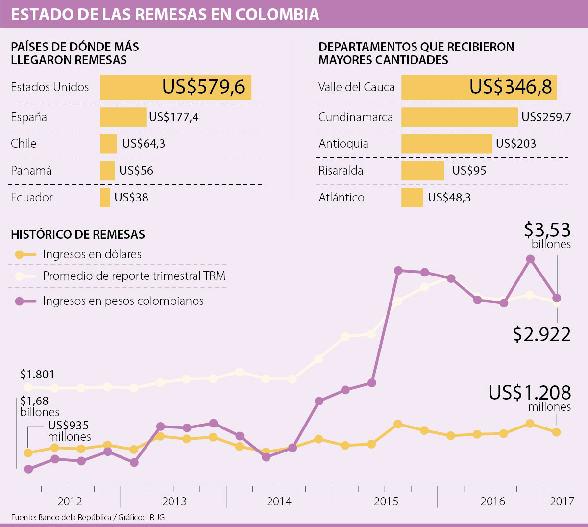 En el primer trimestre de este año, las remesas que entraron alcanzaron los US$1.208 millones, mientras que en el mismo periodo de 2016 llegaron a US$1.162 millones. Aunque el monto subió en dólares, las personas que recibieron los dineros en Colombia vieron afectadas por el precio de la moneda estadounidense.