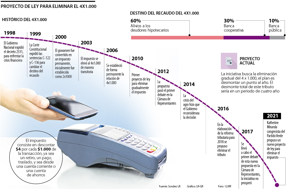 “La eliminación gradual del 4 X 1.000 busca desmontar un punto al año. El desmonte total de este tributo sería en un periodo de cuatro años”, manifestó Miranda sobre su iniciativa. Sin embargo, esta no es la primera propuesta que se presenta con el mismo propósito, en su historia, dos proyectos de ley intentaron acabar con el impuesto, pero sin éxito.