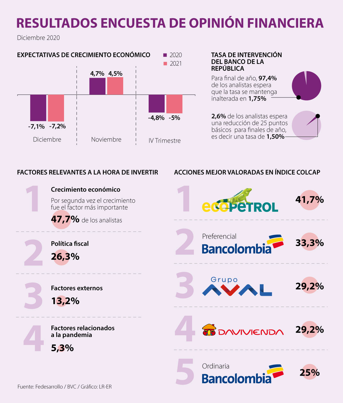 En diciembre, la acción ordinaria de Ecopetrol se ubicó en el primer lugar del ranking, con 41,7% de las participaciones de los analistas. Le siguen las acciones preferenciales del Grupo Bancolombia con 33.3% de preferencia, Grupo Aval con 29,2%, que aunque se mantiene en el ranking reportó una pérdida de preferencia respecto a los números dados en noviembre, Davivienda con 29,2% y finalmente la acción de Bancolombia que es preferida por 25,0% de los encuestados.