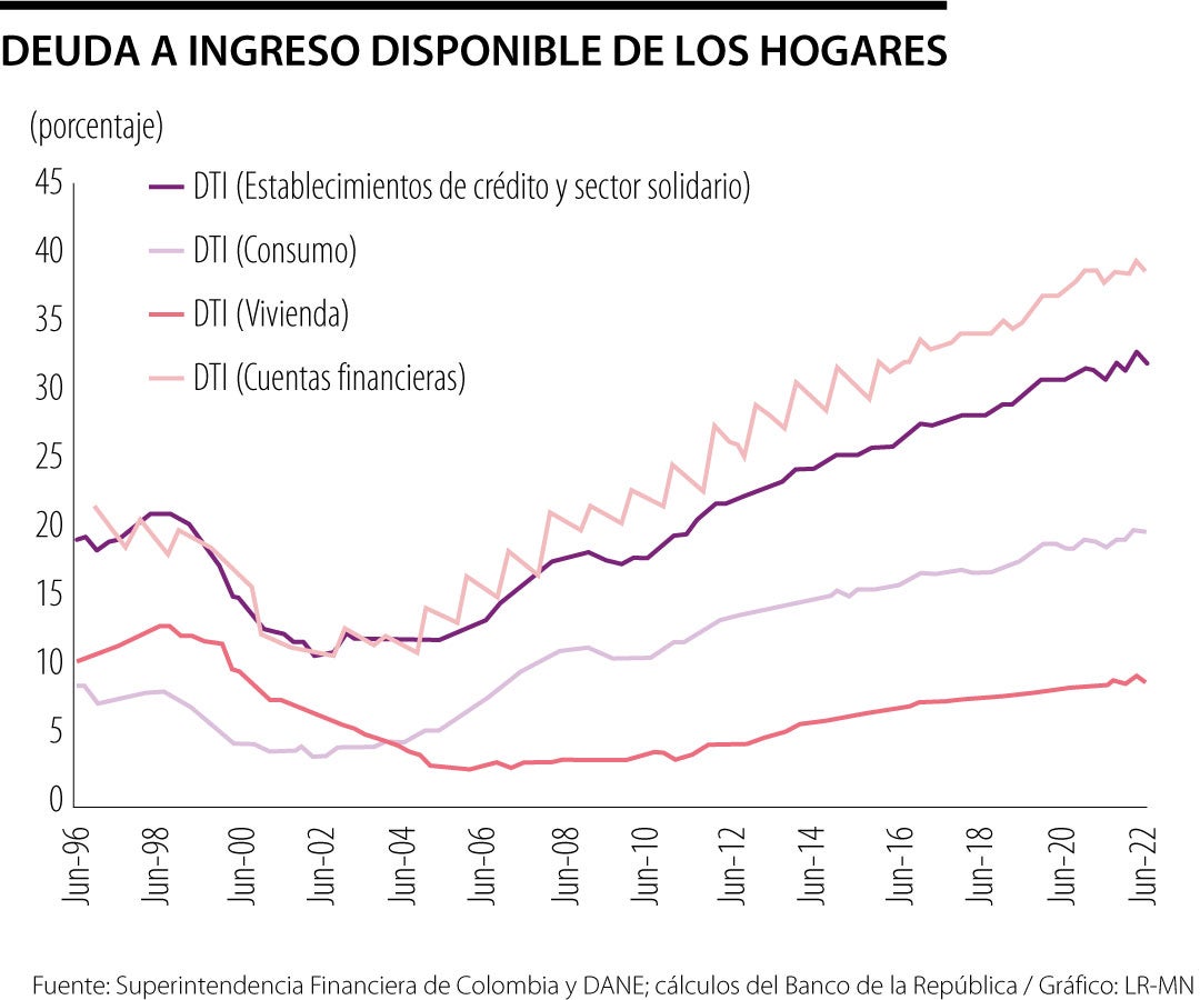 Además, aun cuando los hogares se recuperaron en materia de ingresos frente a época de pandemia, la razón de deuda de ingreso disponible se mantuvo alrededor de máximos históricos en lo corrido de 2022, siendo la cartera de consumo la más representativa.