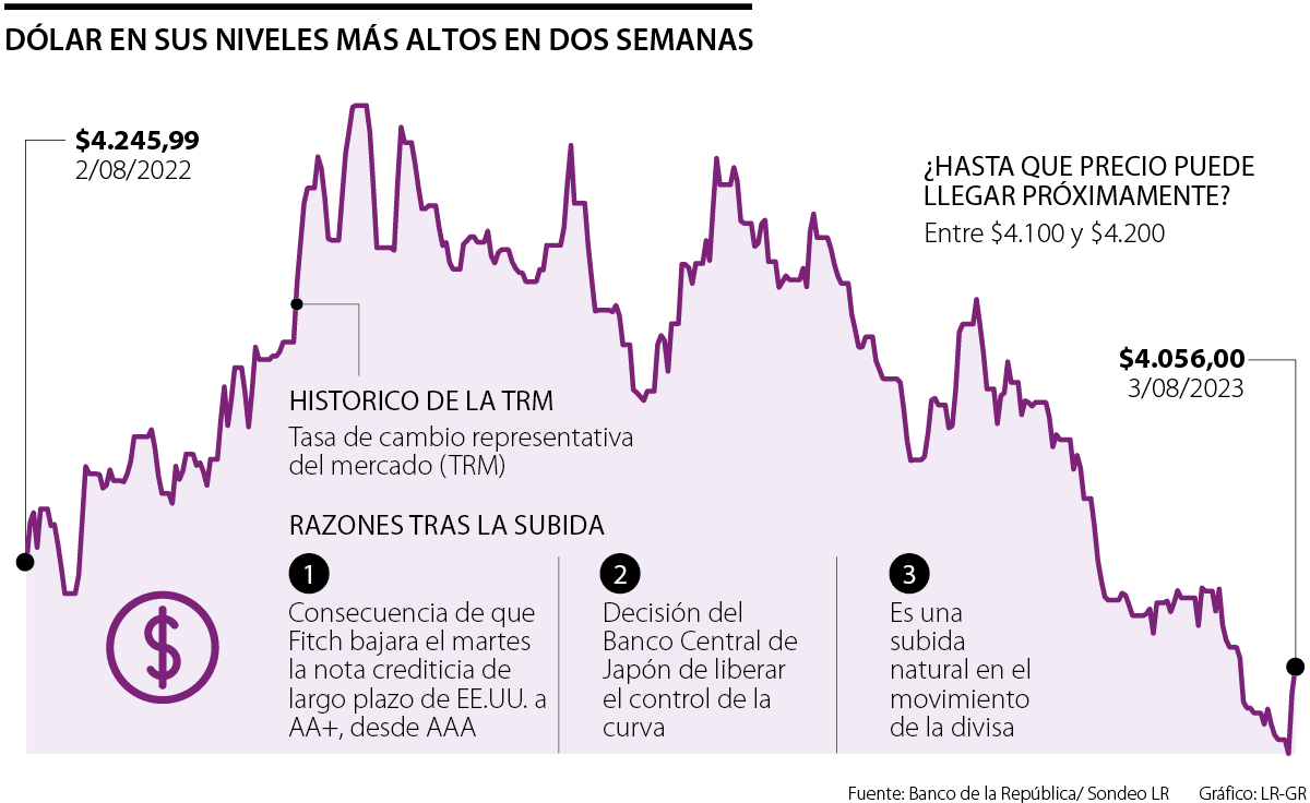 “El dólar está reaccionando al alza luego de que Fitch recortará la validación de EE.UU. estamos viendo durante los últimos días un aumento en la demanda por activos refugio que se ha concentrado en dólar al ser la divisa más líquida a nivel global”, explicó Juan David Ballén, director de análisis y estrategia de Casa de Bolsa.