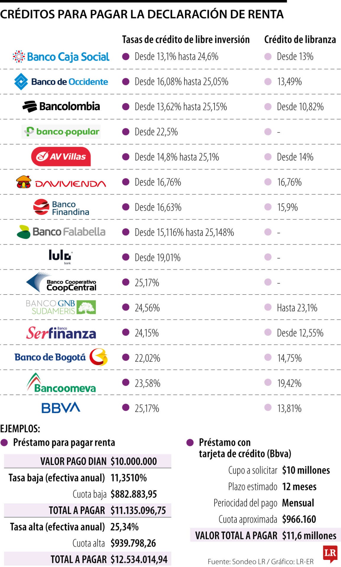 Bancolombia, otra de las entidades más importantes del país, tiene un interés desde 13,6% hasta 25,1% E.A. para un crédito de libre inversión; su valor para el préstamo de libranza es de 13,49%. En materia de préstamo libre y libranza, respectivamente, Banco de Bogotá tiene 22,02% E.A. y 14,75% E.A; Bbva Colombia cuenta con 25,1% E.A. y 13,8% E.A.; y AV Villas cuenta desde 14,8% hasta 25,1% E.A. y 14% E.A., respectivamente.